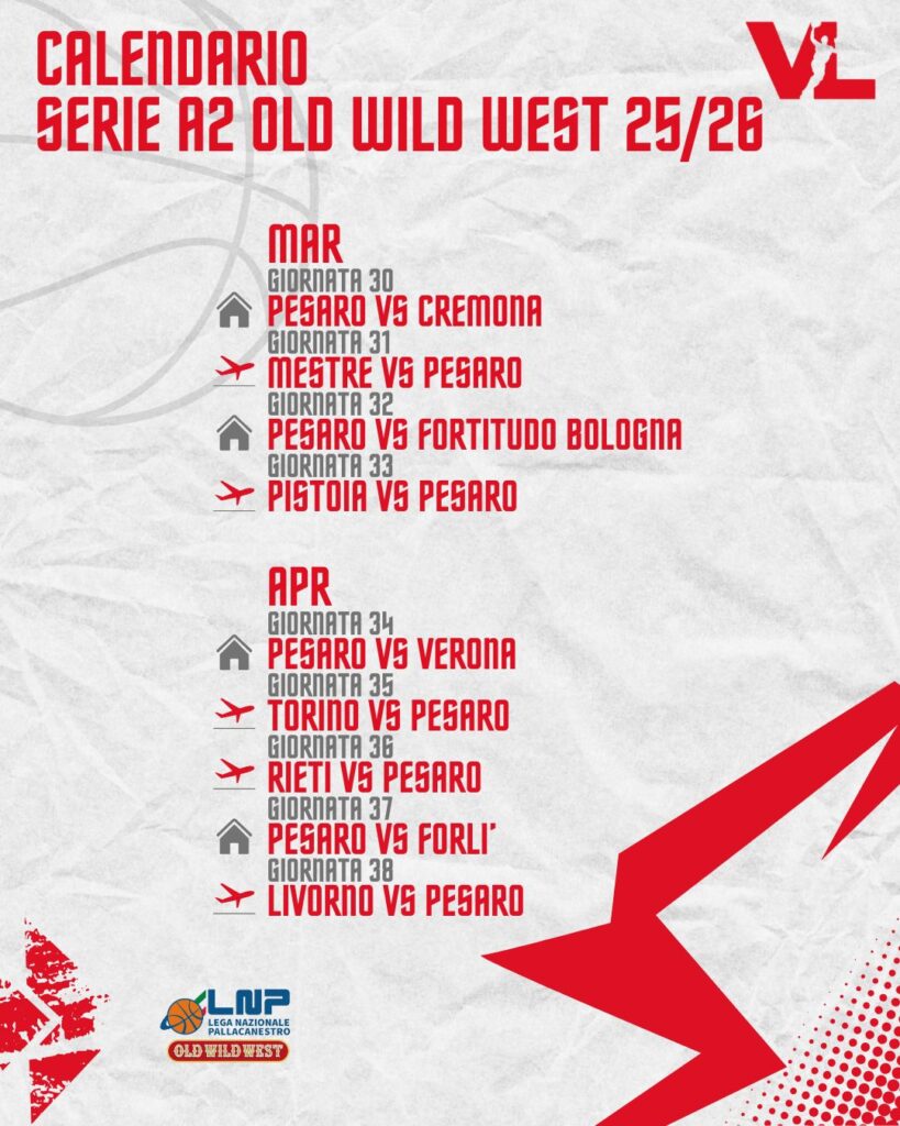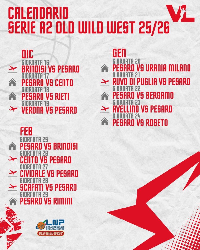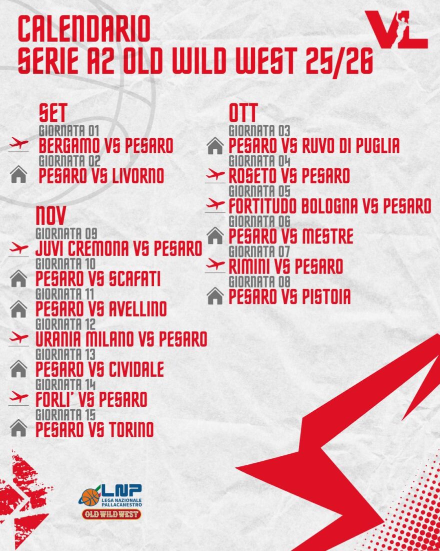 Un viaggio lungo 38 match per una stagione che si preannuncia avvincente e ricca di sfide interessanti: il campionato di Serie A2 Old Wild West 2025/2026 per la VL Pesaro partirà domenica 21 settembre in trasferta, sul parquet di Bergamo contro la Gruppo Mascio. La prima casalinga, alla Vitrifrigo Arena, è in programma sette giorni dopo contro Livorno, seguita da un altro match casalingo contro la neopromossa Ruvo di Puglia.