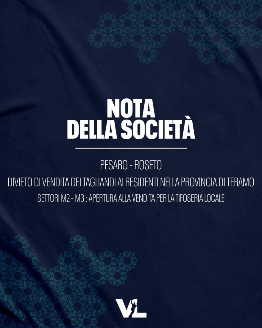 La Victoria Libertas Pallacanestro Pesaro comunica che la Prefettura di Pesaro e Urbino ha disposto in data odierna il divieto di vendita dei biglietti per i residenti nella provincia di Teramo per l’incontro della 24^ giornata del campionato di Serie A2 in programma domenica 25 gennaio alle 18:00 alla Vitrifrigo Arena contro la Liofilchem Roseto. La decisione è stata assunta in base alla determinazione n.4 del 20/01/2026 adottata dal Comitato di Analisi per la Sicurezza delle Manifestazioni Sportive del Ministero dell’Interno per l’evento che “risulta connotato da elevati profili di rischio riconducibili alla rivalità tra le due tifoserie”.