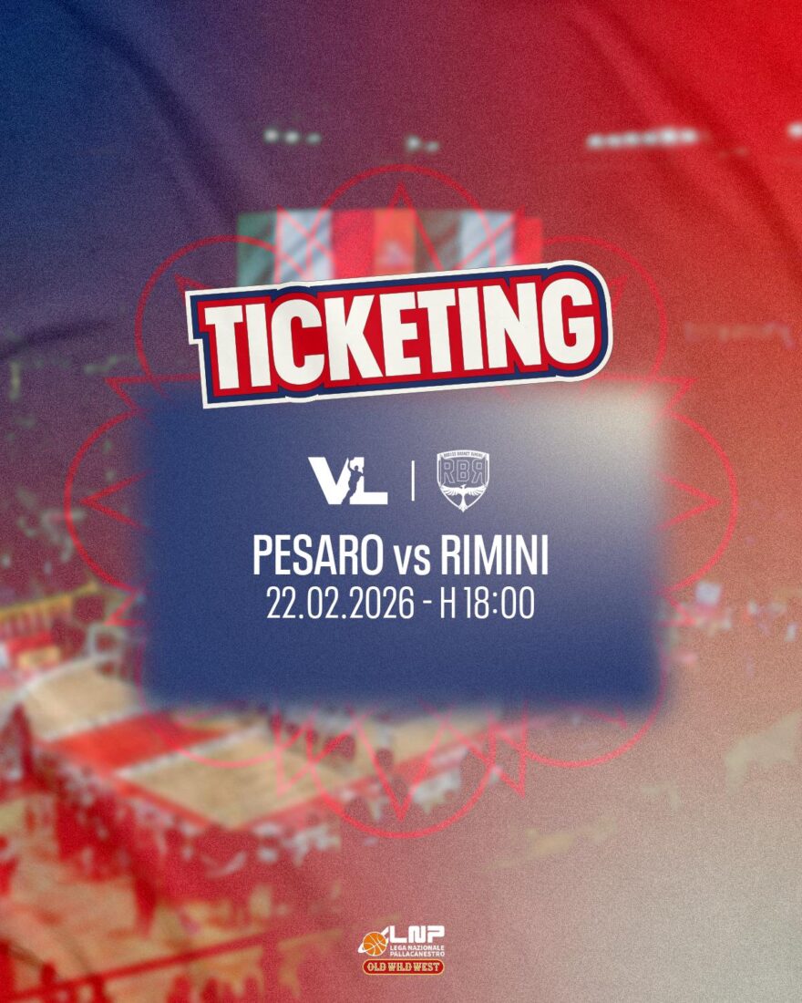 La Victoria Libertas Pallacanestro Pesaro comunica che sono in vendita i biglietti per il match della 29^ giornata del campionato di Serie A2 Old Wild West contro la Dole Basket Rimini in programma domenica 22 febbraio alle 18:00 alla Vitrifrigo Arena.