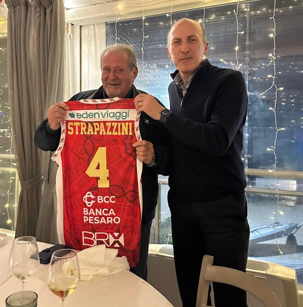 Il Presidente della VL Andrea Valli ha consegnato a Strapazzini una maglia personalizzata, con il numero 4. Inoltre, il numero uno della Società di via Bertozzini col capitano Lorenzo Bucarelli hanno ringraziato il Club Nautico per la splendida ospitalità con un’altra canotta col numero 1949, anno di fondazione del Club Nautico. VL e Club Nautico, un binomio dove tradizione e futuro sono fianco a fianco per portare sempre in alto il nome della città di Pesaro.