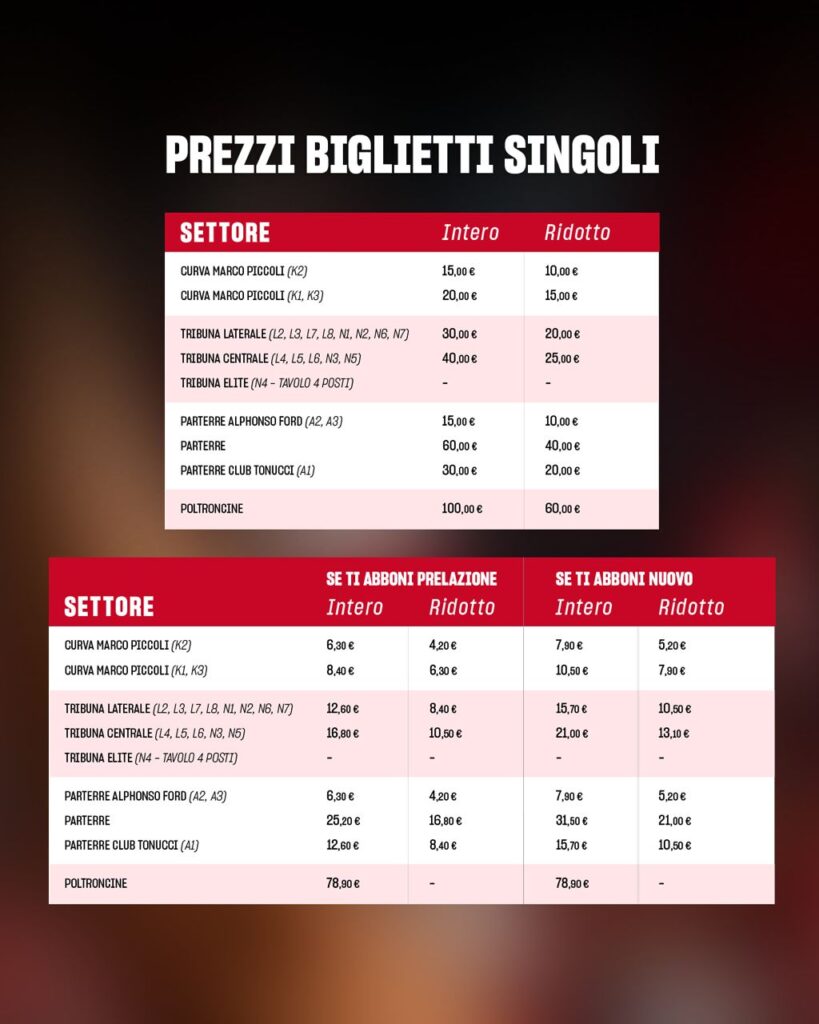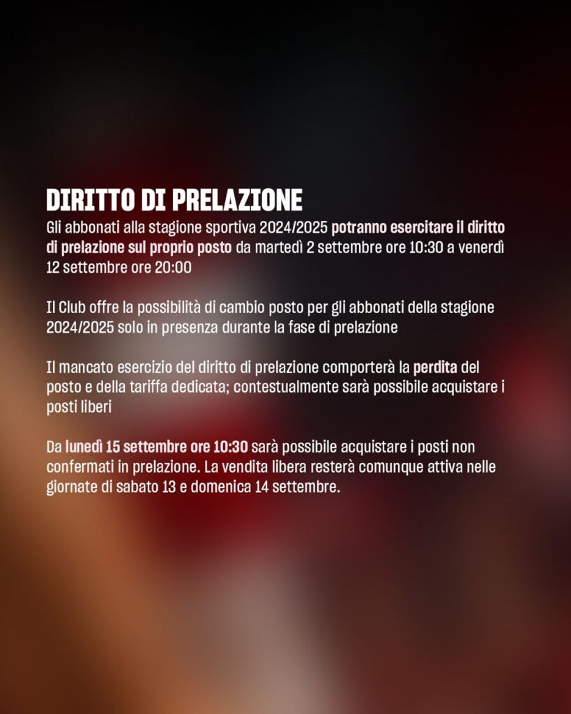 Da martedì 2 a venerdì 12 settembre i vecchi abbonati potranno esercitare il diritto di prelazione sui propri posti, a una tariffa agevolata. Contestualmente, sarà possibile acquistare i posti liberi (per i nuovi abbonati). Sabato 13 e domenica 14 settembre la vendita resterà comunque attiva.
