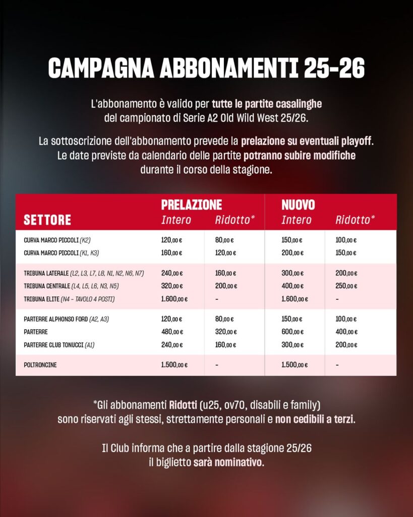 Michela Di Marco, CEO Assistant e Responsabile Ticketing Victoria Libertas Pallacanestro Pesaro: “Siamo partiti da una riorganizzazione dei settori e successivamente ad uniformare le tariffe in modo tale che i tifosi abbiano un’idea chiara di ciò che acquistano. Strategia che prevede un risparmio di 11 partite su 19 per i vecchi abbonati in fase di prelazione e di 9 partite su 19 per i nuovi abbonati. Ancora valide le Promo Family e Porta un Amico; introduzione della tariffa Business. Si è passati dalla tariffa Under 18 a quella Under 25 per aumentare il numero di giovani presenti in Arena e abbiamo reintrodotto la tariffa Over 70 che mancava da qualche stagione; agevolazioni per i disabili. Fanzone in prelazione per chi ancora ne ha diritto con figli Under 14, in alternativa tariffa prelazione per altri settori. Ingresso omaggio per gli abbonati VL per le partite casalinghe del Bramante Basket Pesaro e voucher sconto presso il locale Salsedine per chi sottoscriverà l’abbonamento presso l’Hotel Clipper”.